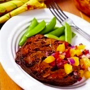 3. Meanwhile peel and dice enough reserved oranges to measure 1 ½ cups. Combine diced oranges, red peppers, olives, onion and reserved 2 teaspoons seasoning in medium bowl; mix well. Serve steaks with relish. Garnish with orange slices and olives.